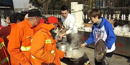 另一邊,在鄭州市花園路廣電南路交叉口,主持人劉雯和韓佳帶著十幾名義工早早的在路邊就開始忙活了。他們要給附近50多名環衛工人煮餃子。平時,環衛工們的午飯都很簡單,甚至都是隨便對付的,這次,主持人和義工們特意選在離工人們中午休息比較近的地方,搭起了臨時的灶臺,給工人們做上一頓熱騰騰的餃子。由于條件簡陋,臨時灶臺上的火十分不穩定,劉雯和韓佳脫下厚重的外套,擼起袖子親自生火,費了好大勁終于把餃子下鍋了。吃上熱騰騰的餃子,環衛工人們特別開心。一位老大爺由衷的感嘆道:“好久沒吃過這么暖心的午飯了,謝謝你們。”