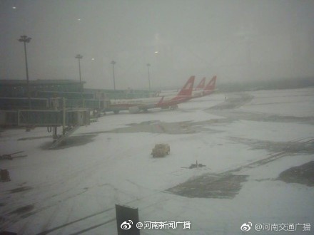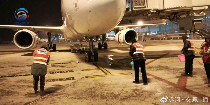 機場信息:早上七點半,鄭州機場仍在降雪,經(jīng)全力工作,南跑道正在安排航班起降,但放行速度較慢。北跑道正在除冰,早上出港航班均有不同程度延誤。請廣大乘客拔打96666問訊,為了保障旅客的安全和順利出行,機場各個崗位徹夜無眠工作。