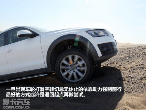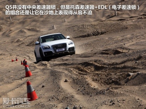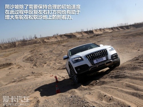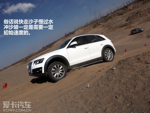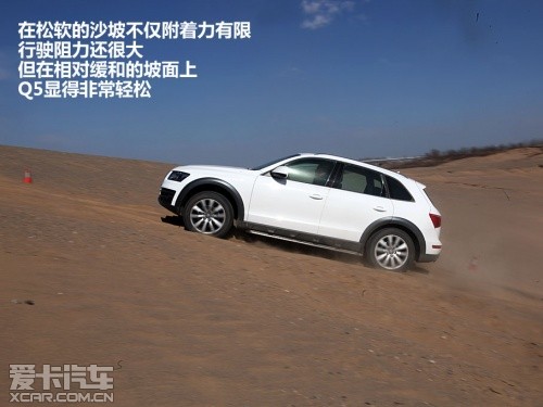 沙坡前半部分的坡度相對要緩一些,而奧迪Q5通過這里的過程自然也是毫不費力。那么在接下來更陡的后半部分當中,坡度的增大導致了車速急劇下降,此時松軟的沙子也就成為了車輛繼續攀爬的絆腳石,恰恰也就在此刻,檢驗quattro四驅系統真正能耐的時候隨之而來。