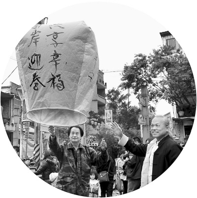 近日,臺灣毫芒雕刻家陳逢顯(右)與傳統(tǒng)天燈工藝大師林國和(左)一起放飛寫有“兩岸迎春· 共享幸福”的天燈。新北市平溪區(qū)放天燈久負(fù)盛名,已有百余年歷史。 王東明攝