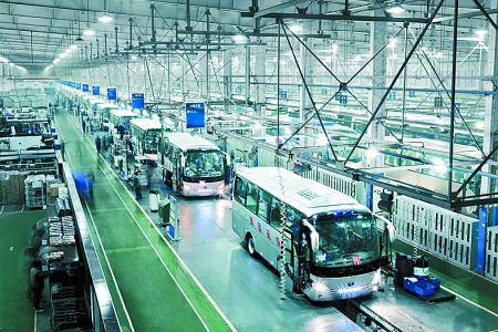4月19日,現(xiàn)代化的宇通客車生產(chǎn)線正快速運(yùn)轉(zhuǎn)。今年一季度,鄭州宇通客車股份有限公司共銷售各類客車10168輛,成為行業(yè)內(nèi)唯一超過萬輛的企業(yè)。其中,共出口各類客車1531輛,出口額達(dá)到了10.12億元,出口量和出口額均名列行業(yè)第一。 河南日報(bào)記者 王 錚 攝