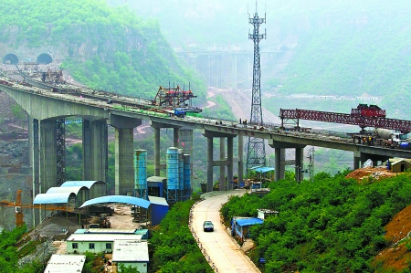 4月24日,林(州)長(治)高速公路林州太行大峽谷段正在緊張施工。該段工程全長2.91公里,施工線路中有3座大橋、3條隧道,地質條件復雜,施工難度大。承擔施工任務的中鐵大橋局的建設者們克服種種困難,現已基本完成主體工程建設,確保了今年11月份通車。