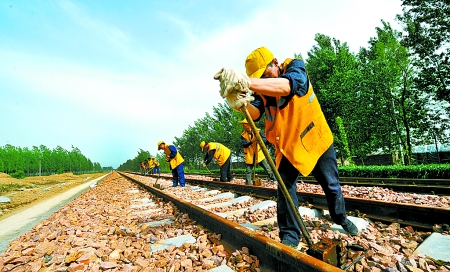 4月27日,我省鐵路工人正在山西中南部鐵路大通道河南濮陽段施工現場,對剛鋪設的道軌進行修整。該鐵路大通道濮陽段自開工以來已完成投資31.68億元,完成路基土石方889.89萬方、橋梁21026米、涵洞5802米、鋪軌166公里。該鐵路建成通車后將成為我國第一條真正意義上的重載鐵路。高 林 劉榮莉 攝