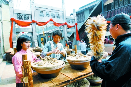 儀式在《大河兒女》專用外景拍攝基地“三河鎮”大戲樓前舉行。三河鎮的三條主街兩側的店鋪已經全部開業,紅綢高懸、人聲鼎沸,穿著長衫馬褂的店小二熱情地招呼著來往的客人,戲樓上的演員正唱得投入,此情此景,讓人恍如穿越到了民國。