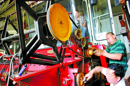 5月7日,武陟縣農機局的技術人員正在幫助農機手檢修小麥收割機。“三夏”臨近,武陟縣農機局組織技術人員深入鄉村,對全縣參加跨區作業的800多臺小麥聯合收割機進行全面檢修,并對機手進行安全操作技能培訓,做好參加跨區麥收“會戰”的準備。 馮小敏 李福利 攝