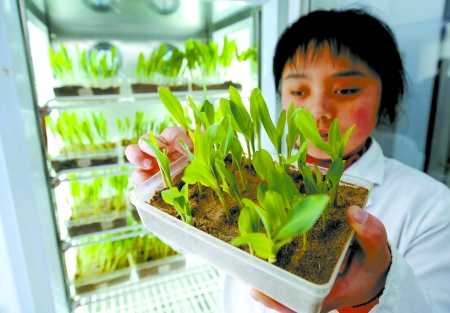 3月27日,浚縣種子站工作人員在查看光照培養箱里培養的種苗。近年來,浚縣實施“科技興糧”戰略,糧食生產連年獲得豐收。目前,浚縣100多萬畝小麥長勢良好。 新華社發