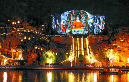 4月13日晚,河南洛陽龍門景區進行了景區亮化工程提升后的首次試燈。2011年12月開始,龍門石窟景區進行亮化提升,目前,景區內的所有燈光已調試就緒,將于近期正式對游人開放。 新華社發