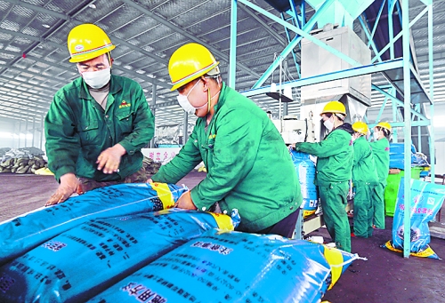 淅川縣源科生物科技有限公司的員工在生產出口俄羅斯等國家的復合肥
