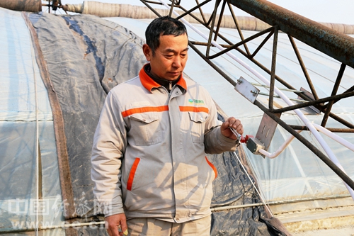 王莊鎮(zhèn)農民陳學文在查看自動化大棚卷簾機