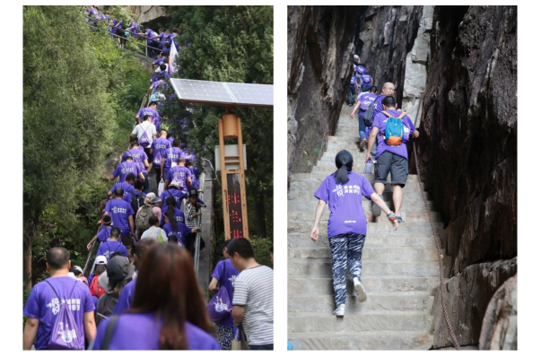 行至盧崖瀑布,泉水自山崖逐級跌落,聚水成潭,仿似人間仙境,令人流連忘返;稍事休整后,1000位登山者通過吊橋、一線天,沿途崖壁陡削,奇石林立。不少人已經開始吃力,身強力壯的男士拉著女友的手一步一臺階地共同攀爬,稚嫩的孩童和爸爸媽媽一起,大手拉小手一邊說笑、暢享山水風光,一邊努力克服陡峭險阻的山路。到了峰頂,無論是浪漫的情侶還是幸福家庭,在群山之巔“一覽眾山小”,感悟真誠和熱情、信任與支持,體會共擔風雨的愛之真諦。