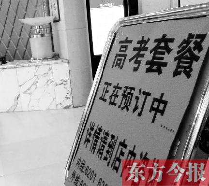 人民路與東里路附近有考點,附近的酒店同樣火爆。一家名為明珠酒店的門頭顯示屏上,有醒目的“高考套餐”字樣,負責住宿的前臺工作人員說,“高考房”已全部預訂出去,僅有少量余房,但是顧客不能挑選樓層、房號,“到時候輪到哪間是哪間”。