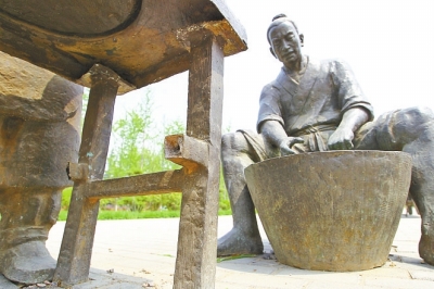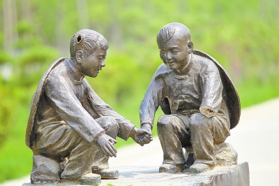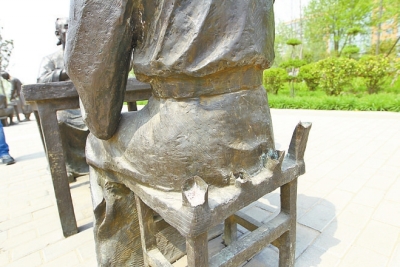其中,第一組雕塑體現(xiàn)的是一個(gè)小男孩和一個(gè)小女孩在一塊石板上玩耍的場(chǎng)景,但十分刺目的是,小男孩右胳膊從腕關(guān)節(jié)上方處被鋸掉,右手不知去向,同時(shí)小女孩的兩個(gè)羊角辮也被鋸了一半;第二組是一個(gè)老年人和一個(gè)年輕人在切磋技藝的場(chǎng)景,但所用桌子的兩個(gè)桌牚均被鋸掉;第三組中,圍繞方桌飲酒賦詩(shī)的幾位老者所坐椅子靠背均被掰掉。