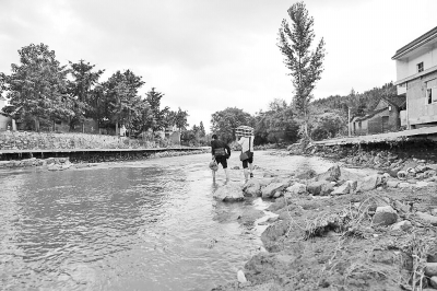 新縣卡房鄉因橋被洪水沖斷,群眾只能涉水過河。記者何正權李鑫攝影