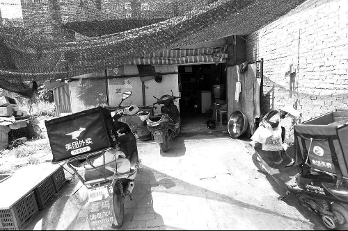 鄭先生所說的作坊,位于某高校東門對面不遠處的一座廢墟旁。如果不是在中午時分,店內不斷傳出鍋勺碰撞的聲音和門口停著的幾輛后置送餐箱的電動車,很難注意到這個僅有10多平方米大小、由破舊的門板搭成的小屋是一家“飯店”。