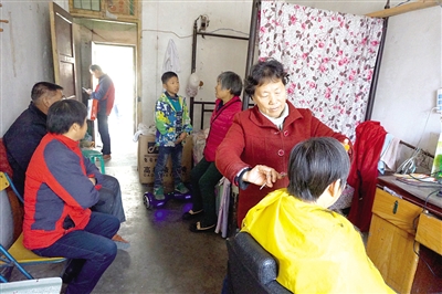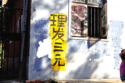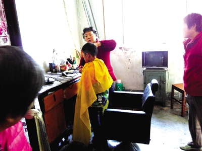 10月30日上午,在省紡機家屬院門口,老太太的理發店門外,黃色油漆寫的“理發三元”的牌子格外醒目,在一間不大的理發店內,除去老太太的一張木板床外就是理發的東西,屋內緊挨門口的長凳上坐滿了前來理發的人們,有大人也有小孩,大家坐在那里一邊等著理發,一邊互相閑聊著。老太太正在給一個十來歲的小男孩理發,旁邊坐著小男孩的爺爺奶奶。一些附近的農民工也不斷進來詢問老太太啥時候有空給他們理發。