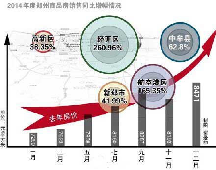 鄭州去年12月份房價達到8471元/平方米,達到歷史最高水平,相比于去年年底漲了1181元。即便如此,經開區和航空港區商品房銷售翻倍。隨著拆遷的進行,租房價格也一路走高,商鋪房租上漲10%,住宅房租漲幅達15%。