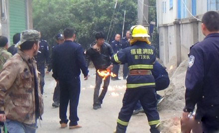 1月26日,廈門同安行政執法局西柯城管中隊在拆除違建過程中,被違建者潑汽油瓶,造成多名執法人員燒傷。違建者柯某的妻子爬上違法建筑的二樓,點燃汽油票向執法人員投擲,并搬出兩罐煤氣罐,同時在自己身上澆灌可燃液體并手持打火機,表示要同歸于盡,柯某到場后撿起正在燃燒的液體瓶向城管中隊長撲去,造成其和另一名隊員燒傷。因妨害公務,柯某昨已被刑拘。
