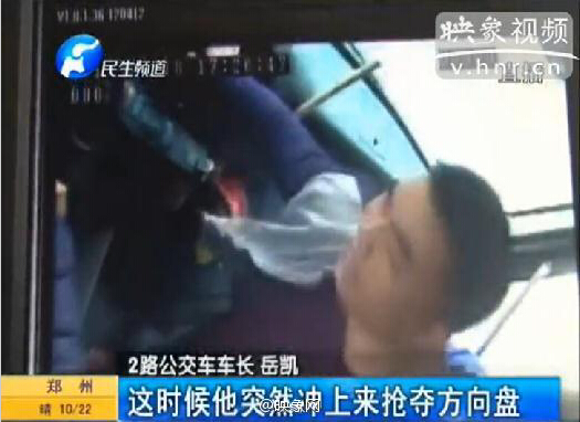 監控顯示,鄭州2路公交車正常行駛中,突然一男子沖上來猛拉方向盤,并與公交車長廝打在一起。男子將車長狠狠地壓在方向盤上,無法動彈。而其動手的原因竟是因為坐過了站,車長沒有及時給他開門。事后,民警對此事進行了調解。