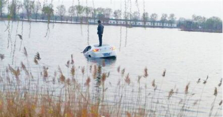 10、濮陽轎車落水車主站車頂等救 倆保安跳湖救人!