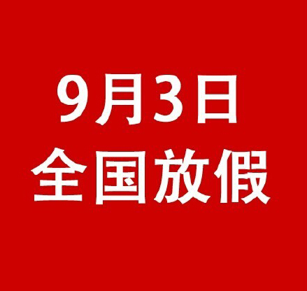 國務院發通知:中國人民抗日戰爭暨世界反法西斯戰爭勝利70周年紀念日(9月3日)放假一天!為方便公眾安排假日期間生產生活,特作如下調休:9月3日至5日調休放假,共3天。其中9月3日(星期四)放假,9月4日(星期五)調休,9月6日(星期日)上班。