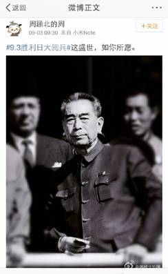 讓人難忘的細節不僅僅在閱兵場上。3日上午9時30分,習近平主席偕夫人彭麗媛正在天安門迎候各國嘉賓,閱兵尚未正式開始,會場內外興奮期待的氛圍漸濃。就在此時,網友“周顧北的周”發布了一條微博“這盛世,如你所愿”,配圖是一張周恩來總理的老照片。短短的七字微博引發了網友的強烈共鳴,轉發已過百萬。“開國大典的時候飛機不夠,周總理說飛兩遍,現在再也不需要飛兩遍了,要多少有多少。山河猶在,國泰民安。當年送你的十里長安街,如今已是十里繁榮。”
