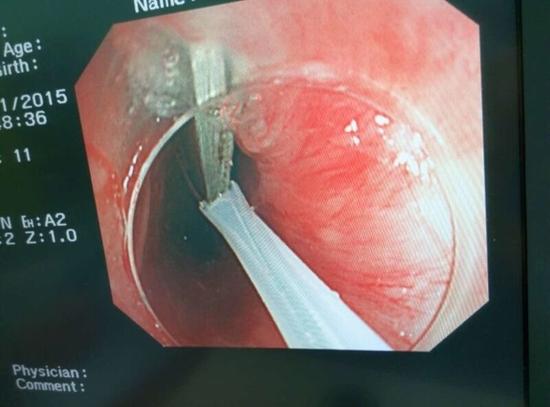 隨后,范醫生先用圈套器套取出了長10厘米的鑷子,再一個一個地取出了打火機。整個取出過程小心謹慎而又一氣呵成,只用了不到10分鐘。