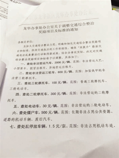 記者在一份由深圳龍華新區龍華辦事處辦公室出具的《關于調整交通綜合整治獎勵項目及標準的通知》的文件中發現,為加大交通綜合整治力度,明確和細化交通綜合整治獎勵項目和標準,保持交通執法的工作積極性,辦事處決定對交通綜合整治獎勵項目和標準予以調整,其中加裝鐵甲的非法營運三輪車每查處一輛獎勵600元,普通三輪摩托車、三輪電動車每輛獎勵100元,對無證駕駛、妨礙執法當事人實施行政拘留的,拘留一人獎勵500元。