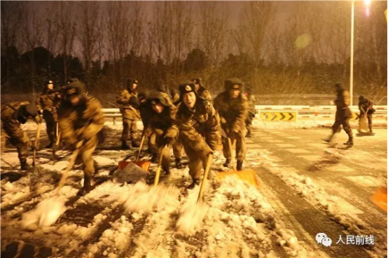 1月25日晚開始,東部戰區和江蘇省軍區緊急派出官兵,奔赴駐地掃雪除冰、清理道路,保障人民出行安全。
