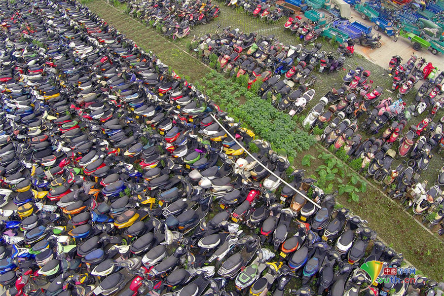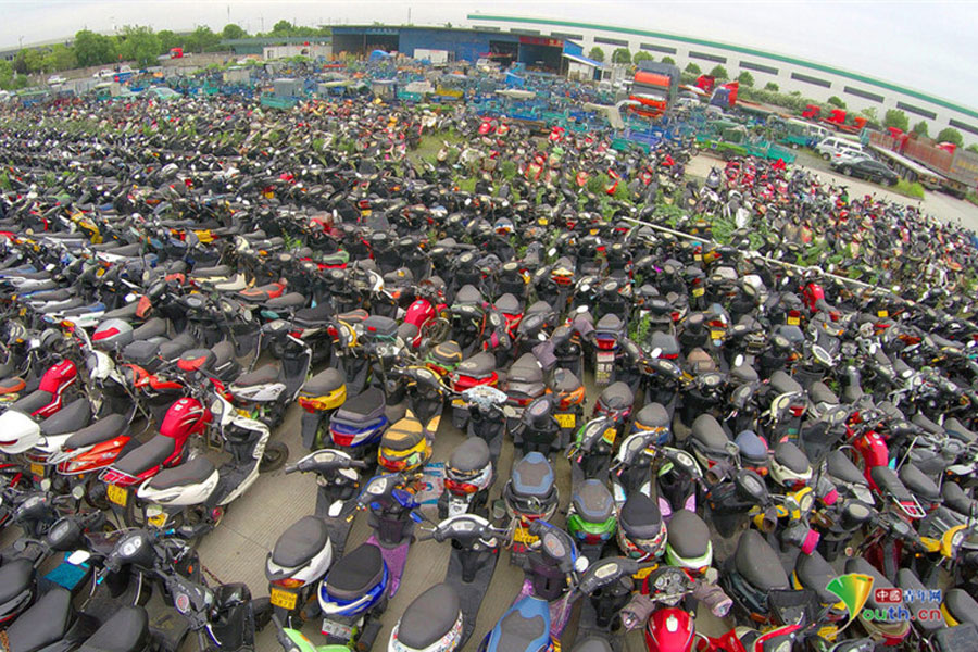 2015年6月4日,超寬、超速、非法營(yíng)運(yùn)三輪電摩及各種摩托車密密麻麻重重疊疊地堆積在一起,從高空中俯瞰場(chǎng)面震撼。這不只是杭州一家報(bào)廢車停車場(chǎng)的情景,幾乎每家停車場(chǎng)都如此。工作人員說,這都是交警執(zhí)法過程中收繳的。工作人員跟記者抱怨說,電摩停放時(shí)間太長(zhǎng),再不拆解都停不下了!據(jù)負(fù)責(zé)人介紹,杭州自禁摩托車以來,總有一些違規(guī)者偷偷地利用摩托車充當(dāng)黑摩的。此舉既不安全,也暗藏各種不安全因素。2014年,杭州有204人死于涉及電瓶車的交通事故;在所有交通事故中,涉及電瓶車的占到四成以上。3月25日,有杭州媒體報(bào)道,杭州收繳的電動(dòng)車已堆滿停車場(chǎng),據(jù)估算馬路上還有百萬輛以上超標(biāo)車。(金童子/攝)