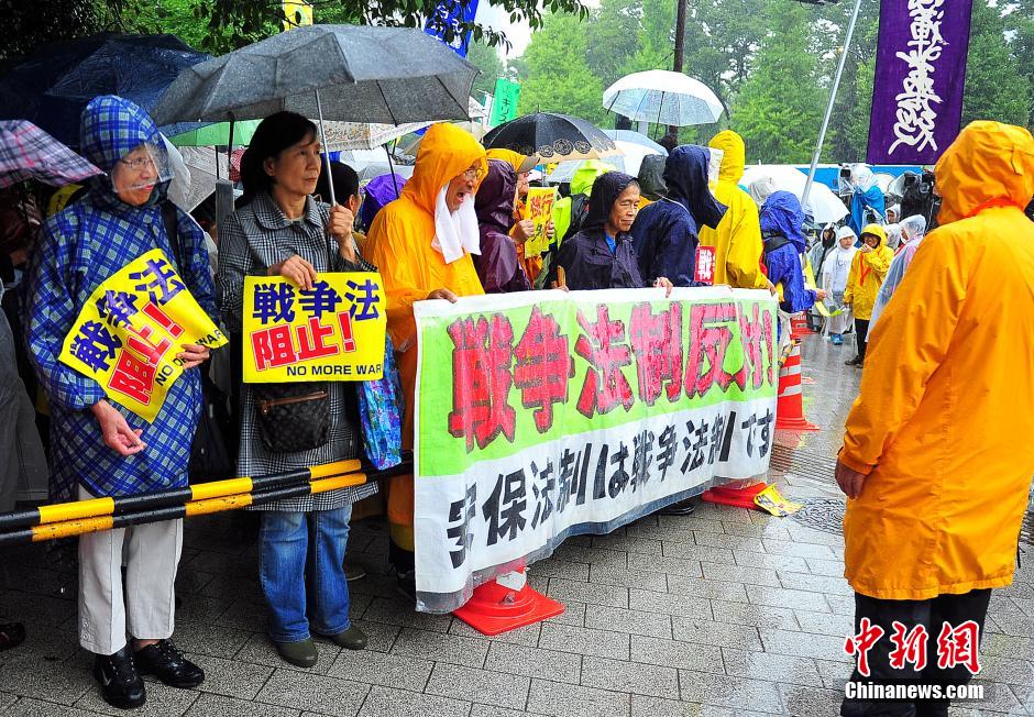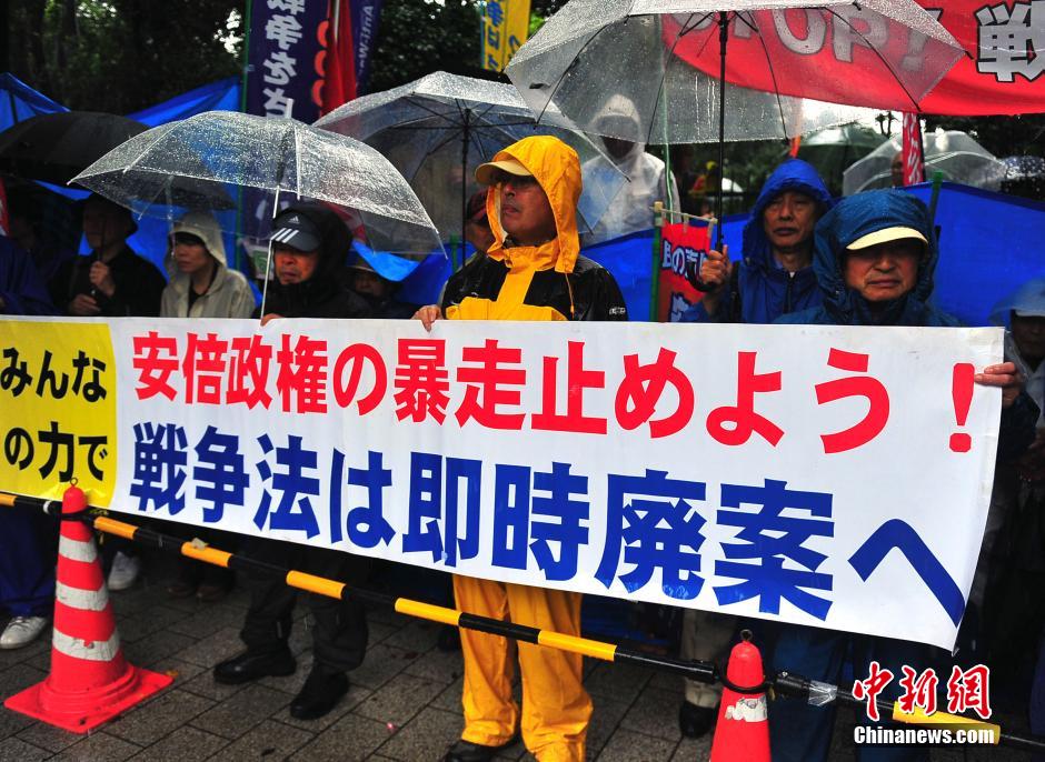 隨著安倍陣營強推以解禁集體自衛權為核心內容的安保法案最終過關的計劃進入“倒計時”,日本民眾的反安保抗議活動再度進入高潮。在之前徹夜抗議之后,9月17日白天,又有眾多日本民眾冒著大雨持續聚集在國會周邊進行抗議活動。中新社發 王健 攝