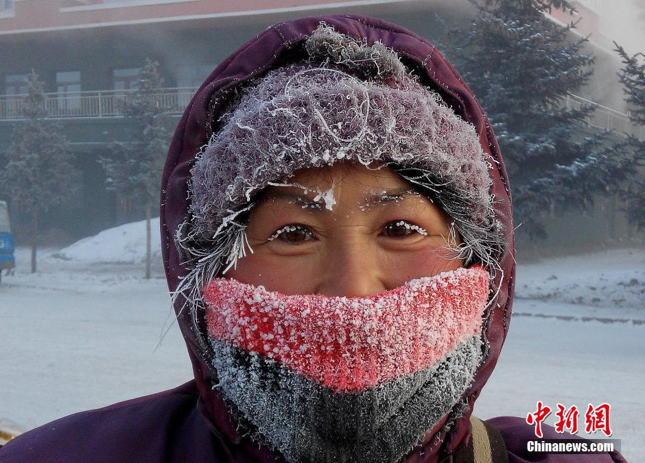 12月26日,內蒙古呼倫貝爾,受強冷空氣影響,呼倫貝爾市境內各地遭遇極端低溫天氣。圖為當日圖里河鎮(zhèn)最低氣溫達-42℃,低溫使市民的臉上瞬間結滿冰霜。 圖片來源:視覺中國
