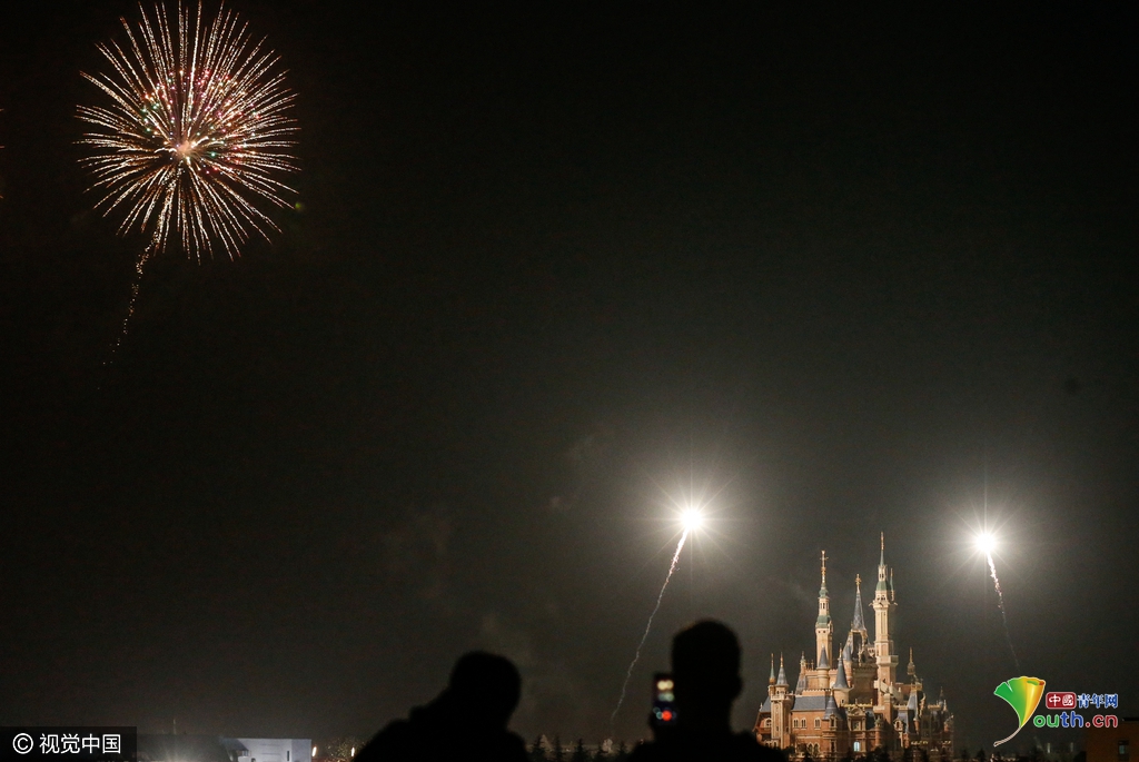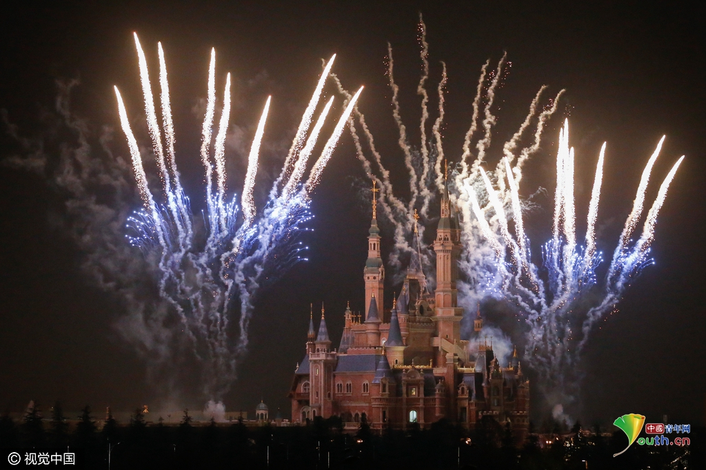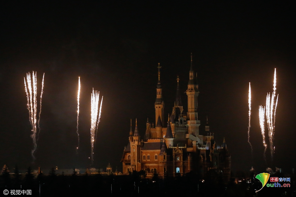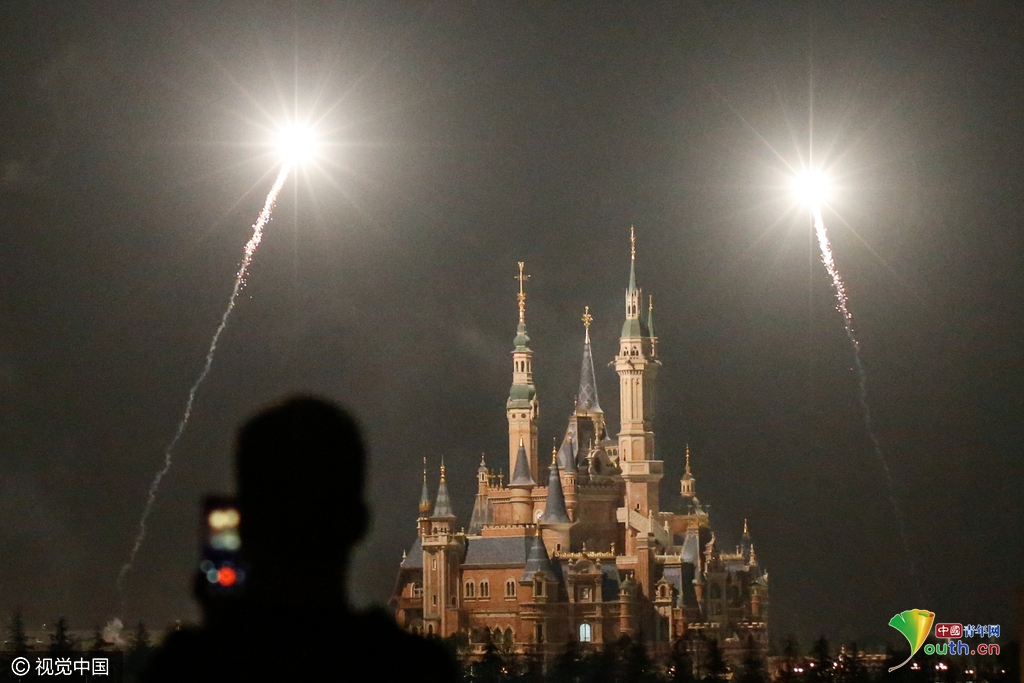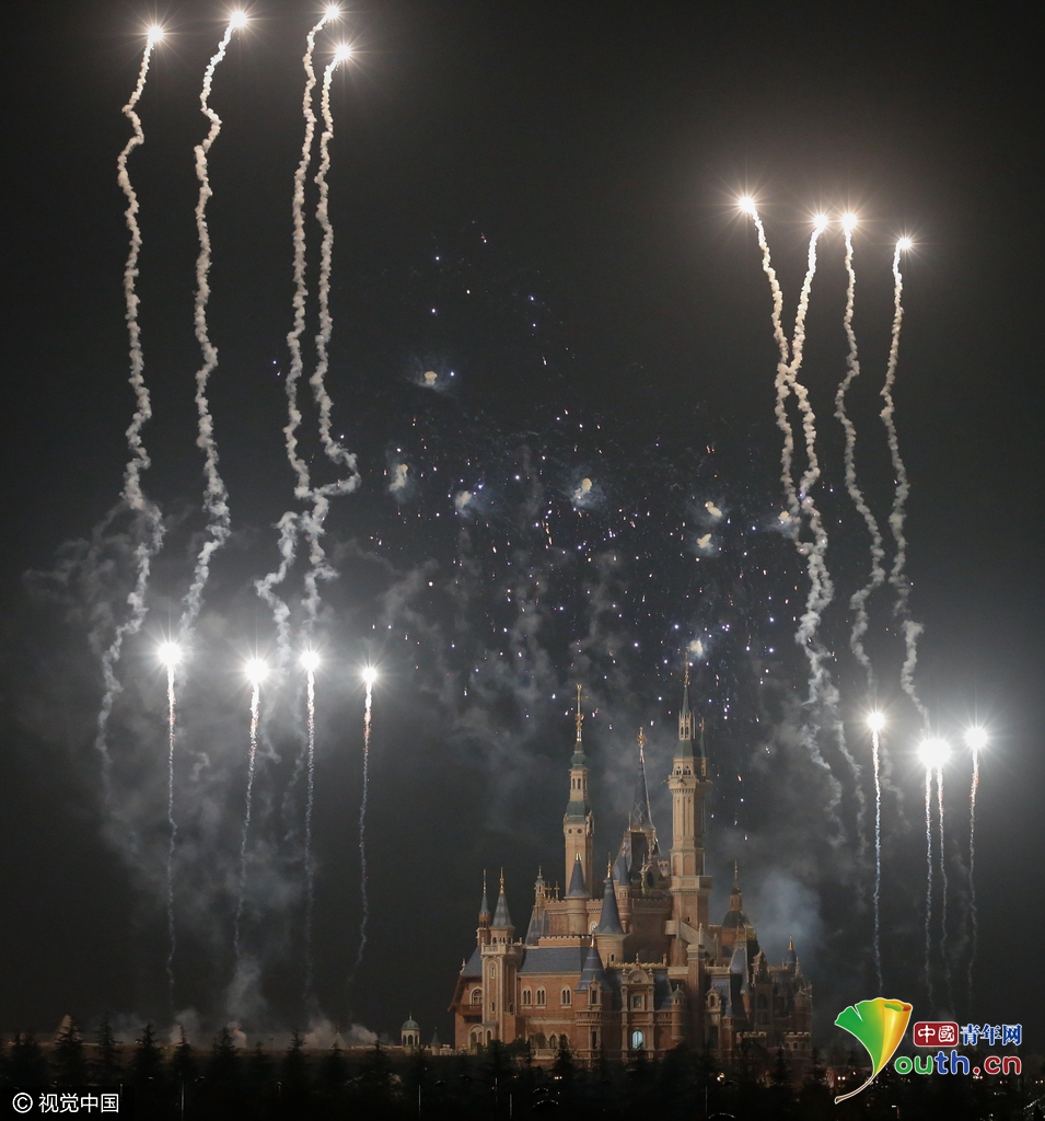 3月28日9點06分,在上海迪士尼樂度假區內中心位置,“奇幻童話城堡”上空及周圍十幾支煙花直指天空,一粒粒金砂噴射而出,在空中綻放,原本漆黑一片的園區在焰火的襯托下顯得絢麗多彩。每組焰火間隔時間為3-4分鐘。