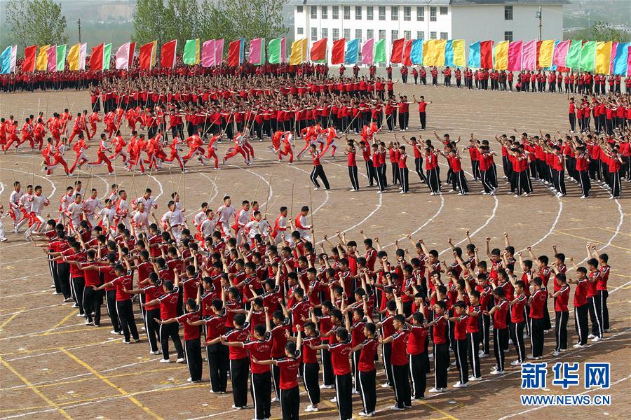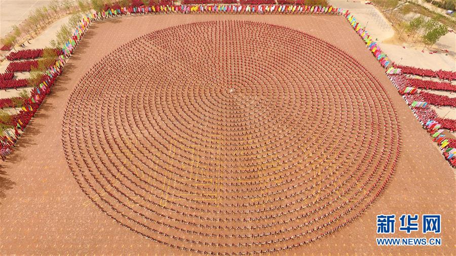4月7日,在河南登封少林塔溝武術學校練功場,上課間操的學員擺出圓形圖案。當日,河南登封少林塔溝武術學校2016年“春訓”拉開帷幕,2.6萬名學員同上陣,進行隊形變換、十八般兵器、少林硬氣功、少林集體棍等多種功法演練。“春訓”是少林塔溝武術學校每年春季開展的一項強化訓練活動,旨在提升學員的耐力和競技狀態。新華社發(牛書培 攝)