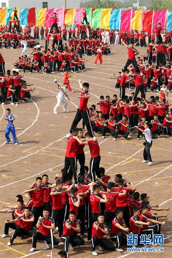 4月7日,在河南登封少林塔溝武術學校練功場,上課間操的學員疊起人塔。當日,河南登封少林塔溝武術學校2016年“春訓”拉開帷幕,2.6萬名學員同上陣,進行隊形變換、十八般兵器、少林硬氣功、少林集體棍等多種功法演練。“春訓”是少林塔溝武術學校每年春季開展的一項強化訓練活動,旨在提升學員的耐力和競技狀態。新華社發(牛書培 攝)