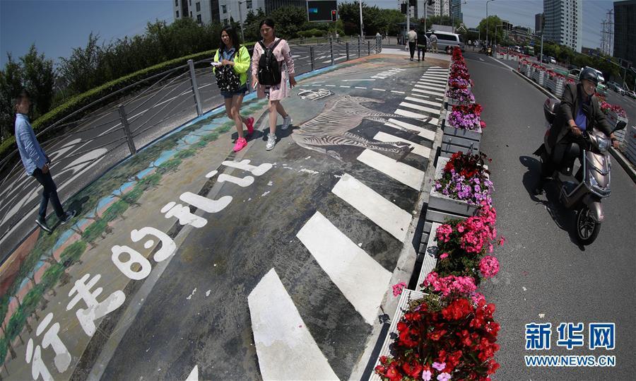 5月16日,行人從上海漕河涇開發區一處3D斑馬線上走過。近日,上海漕河涇開發區的一條人行橫道線變身一幅3D效果圖畫,還“植入”了宣傳行走禮讓的標語,呼吁文明出行。 新華社記者 凡軍 攝 圖片來源:新華網