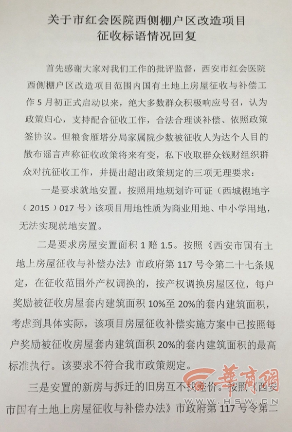 西安市紅會醫院西側棚戶區改造項目房屋征收補償工作指揮部對此事的回復