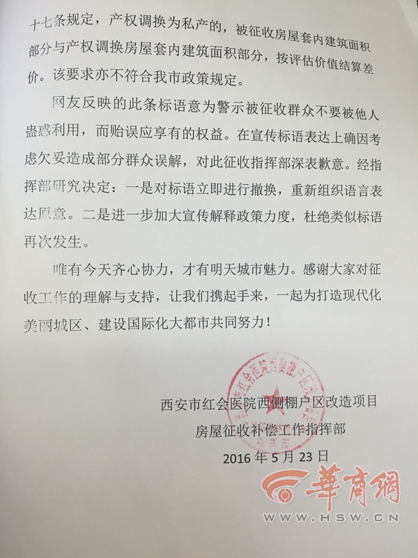 “這些要求都不符合西安市政策規定,在5月20日宣傳期結束后,我們制作了網友看到的橫幅,主要是提醒其他群眾不要受他人蒙蔽、蠱惑,盡早簽約,不要延誤應享有的權益。也希望這些為達個人目的,對拆遷工作進行抵抗的群眾,能遵守西安市的政策規定,按規定簽約。”劉組長說道。