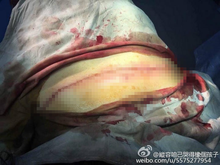 在醫院治療時,有人幫她拍下一組照片。其中一張,該年輕女子趴在手術臺,可明顯看到其后頸下方15厘米處,有一條從左手腋窩延生至右肩的傷口,醫生正對其進行手術。而另一張圖片,是其傷口縫合后情況,背部有一條如蜈蚣般的傷痕,令人觸目驚心。