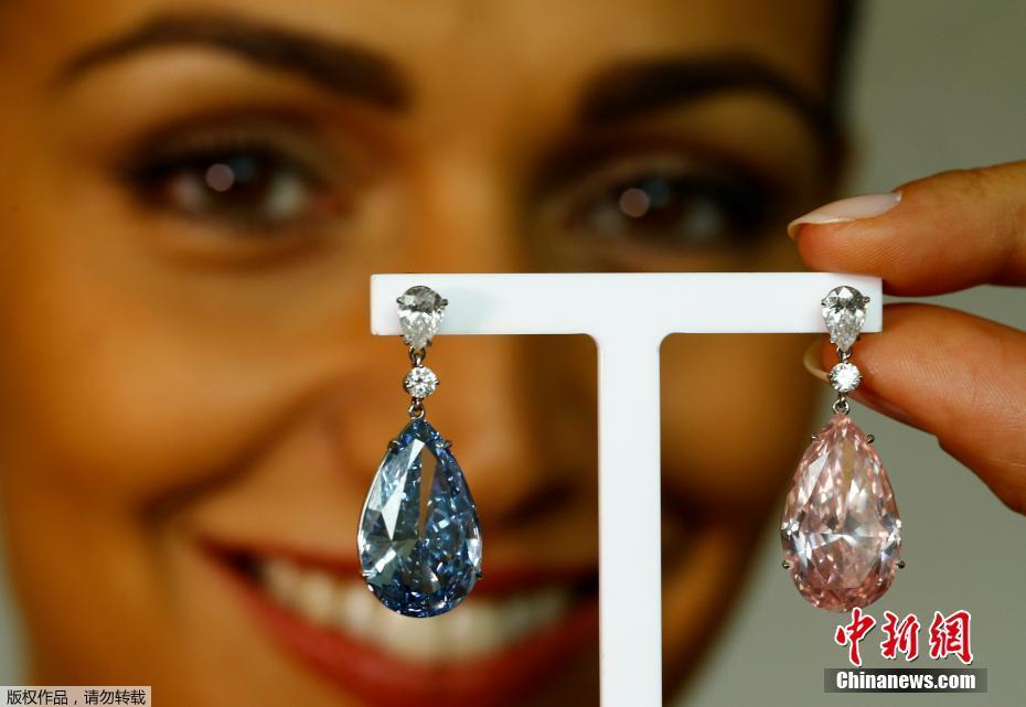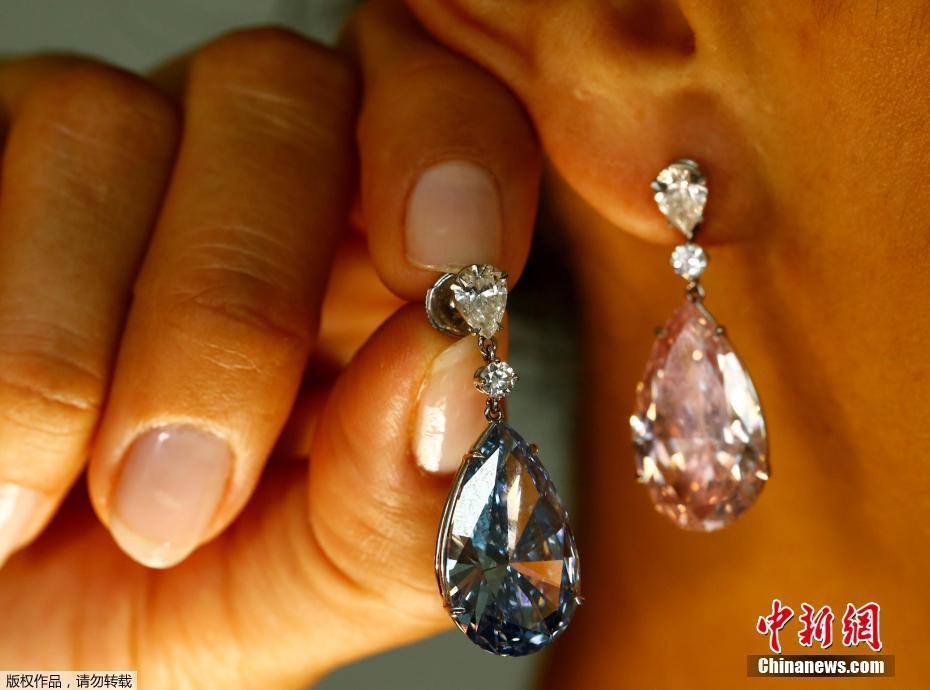 當(dāng)?shù)貢r(shí)間2017年5月11日,瑞士日內(nèi)瓦,14.54克拉的“阿波羅藍(lán)”和16克拉的“阿耳特彌斯粉”鉆石耳環(huán)即將在蘇富比拍賣行拍賣,估價(jià)分別為3800-5000萬美元和1250-1800萬美元。