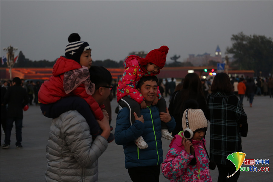騎在家長(zhǎng)頭頂上觀看降旗儀式的孩子們。中國青年網(wǎng)通訊員 李超 攝
