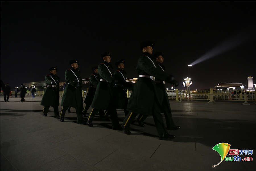 領(lǐng)班員李雪雷站著挺拔的軍姿在廣場(chǎng)中間執(zhí)勤,絲毫看不出他的“冷”。中國青年網(wǎng)通訊員 李超 攝