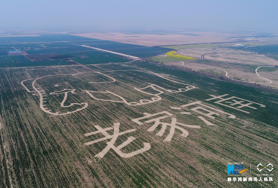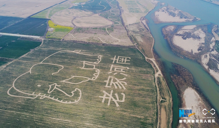 3月25日在黃河濕地豐樂(lè)大河牧業(yè)種植區(qū)航拍的巨幅農(nóng)業(yè)創(chuàng)意圖《老家河南》。