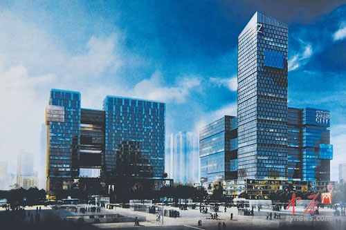 此區域中的標志性建筑,是和西廣場緊鄰的高星級酒店,高40多層、180米,酒店下邊為購物廣場。和酒店相鄰,還有一棟高層樓房,為寫字樓和購物廣場。