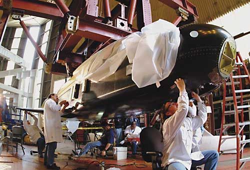 正在制造中的X-37B。X-37太空飛機,也簡稱為“X-37”,是美國國防部與宇航局共同制定的“FALCON”計劃、為實現(xiàn)“快速全球打擊”的構(gòu)想而研制的一種空天飛機。這種空天飛機在兩小時內(nèi)可攻擊地球上任意一個目標。“X-37”太空飛機是“FALCON”項目中的第一個預研型號,是與微型航天飛機相似的飛行器。它將驗證NASA軌道太空飛機項目中25項創(chuàng)新的航天技術。