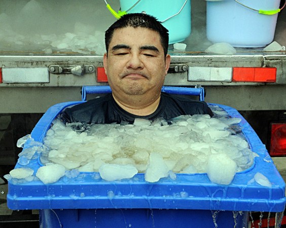 2014年8月22日,陳光標發微博稱“陳光標坐垃圾桶挑戰冰桶記錄”,圖為陳光標坐在充滿冰水的垃圾桶內被潑冰水。