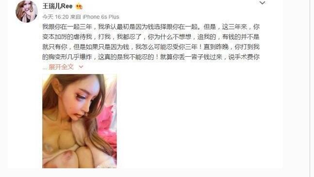 近日,曾有“第一網紅”之稱的嫩模王瑞兒在微博發文自曝被男友嚴重家暴,她大膽曬出右眼紅腫不堪、嘴角流血的“被虐打”慘狀,并稱胸被打到“變形幾乎爆炸”,和劉梓晨神似龍鳳胎。據稱,王瑞兒整容過的假胸價值高達百萬。王瑞兒自稱與男友交往三年,大方承認最初在一起是貪圖對方“有錢”,三年來遭受了無休止的虐待和毆打,此次更是變本加厲險些將胸“打爆”,這才怒而提出分手:“請你滾蛋,從此遠離我的生活……如果再跟你在一起,我將萬劫不復!”