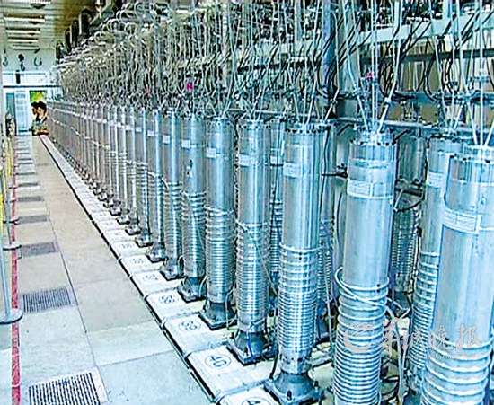 伊朗電視臺顯示了納坦茲核設(shè)施內(nèi)的鈾濃縮設(shè)備(2012年2月15日拍攝)。