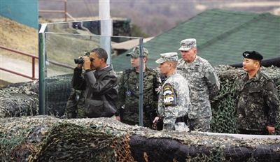 25日,準備參加首爾核安全峰會的美國總統奧巴馬剛抵達韓國,便來到東北亞地區“火藥味”最濃的地點——韓朝非軍事區(三八線)訪問。在這個韓朝兩軍嚴密把守的敏感地區,奧巴馬拿起望遠鏡,近距離觀察朝鮮。
