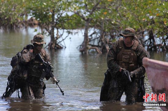4月25日,美國與菲律賓“肩并肩2012”聯合軍演參演部隊在菲律賓南部巴拉望省普林塞薩港市的阿魯甘灣舉行“兩棲登陸”演練,美菲雙方近百名海軍陸戰隊士兵參加。這也是美菲“肩并肩2012”聯合軍演開幕10天以來,開放媒體采訪規模最大的一場軍事演習活動。圖為美菲海軍陸戰隊先遣小分隊登上灘頭。記者張明攝