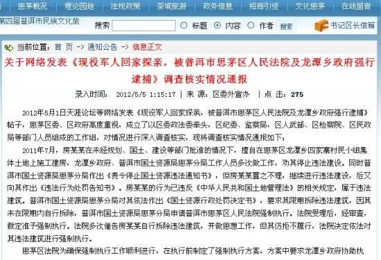 2012年5月1日天涯論壇等網絡發表《現役軍人回家探親,被普洱市思茅區人民法院及龍潭鄉政府強行逮捕》帖子,思茅區委、區政府高度重視,成立了以區委政法委牽頭,區紀委、監察局,區人武部、區檢察院、區民政局等部門人員組成的工作組,對情況進行深入調查核實,現將調查核實情況通報如下:
